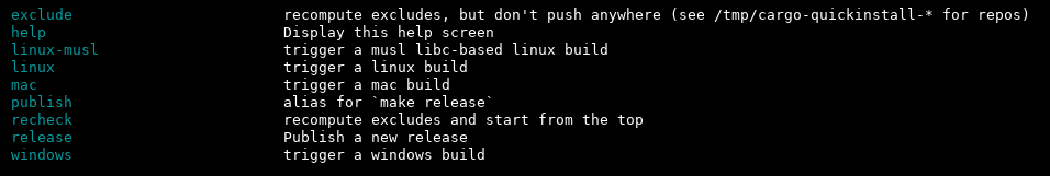 .PHONY: help help: ## Display this help screen @grep -E '^[a-z.A-Z_-]+:.*?## .*$$' $(MAKEFILE_LIST) | sort | awk 'BEGIN {FS = ":.*?## "}; {printf "\033[36m%-30s\033[0m %s\n", $$1, $$2}'Simple and efficient, here is the result
