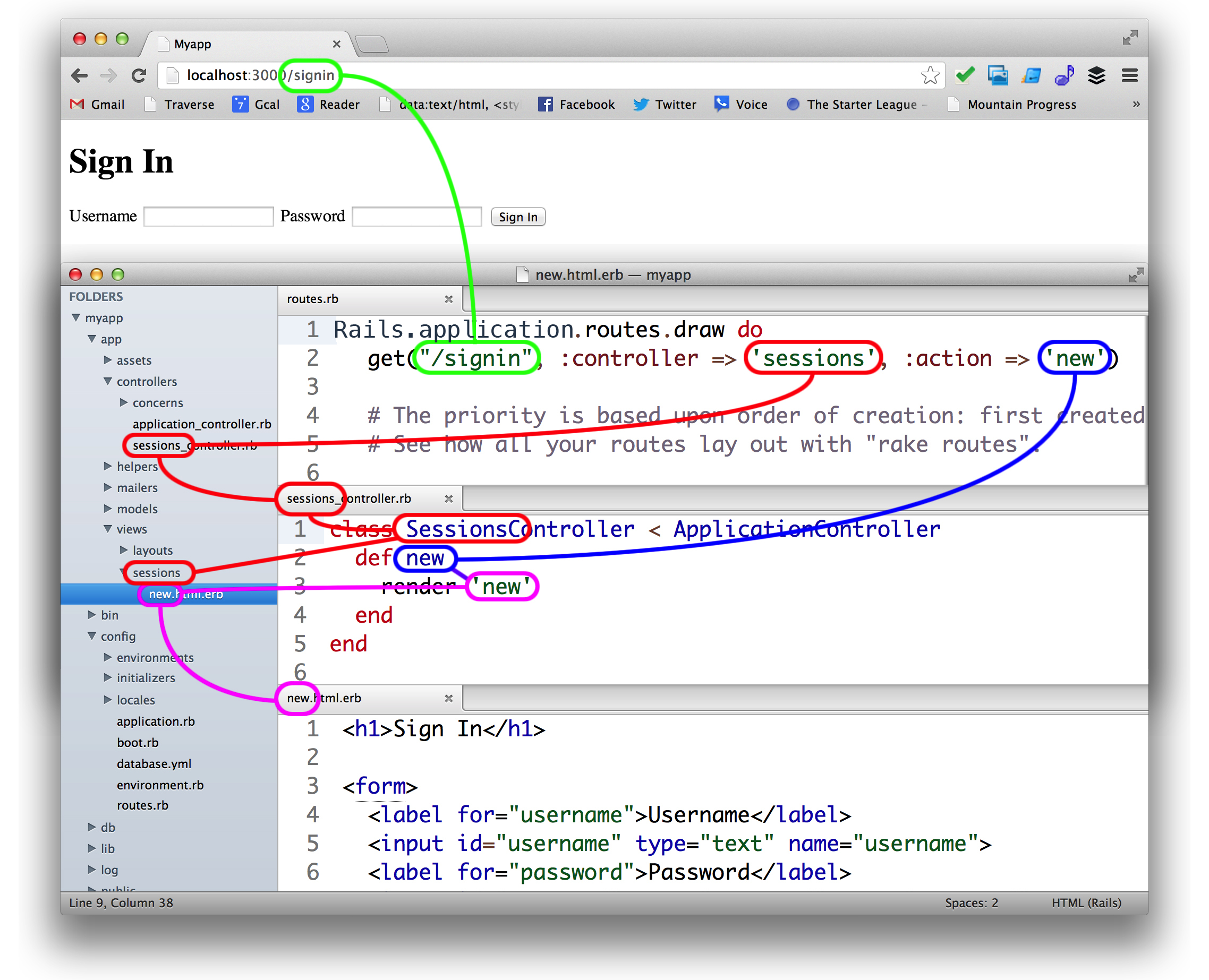 So remember: everything always starts with a route between a URL we want to support and a Ruby method that will be responsible for generating a response to the user's browser.
