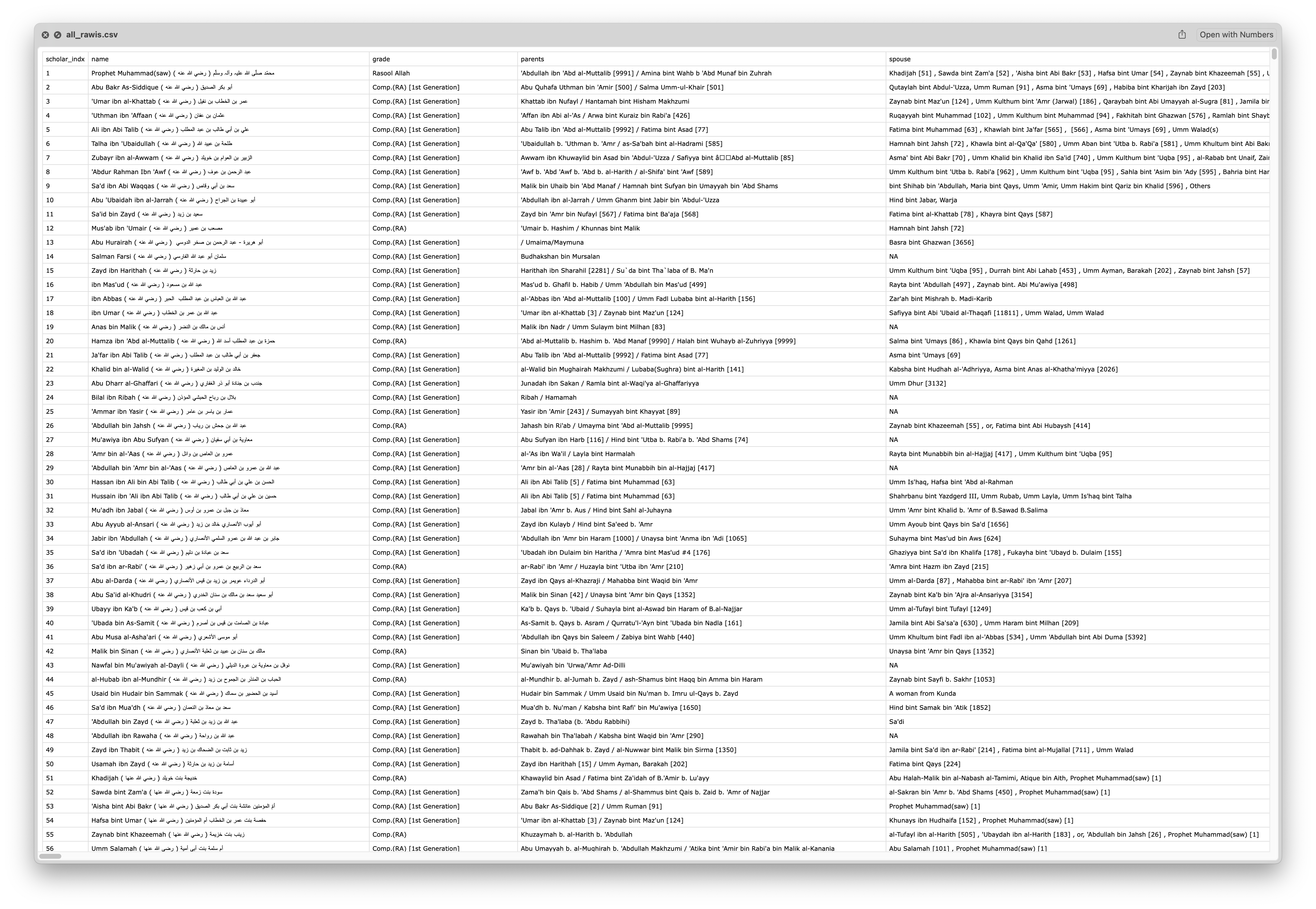 3,'Umar ibn al-Khattab ( عمر بن الخطاب بن نفيل ( رضي الله عنه,Comp.(RA) [1st Generation],Khattab ibn Nufayl / Hantamah bint Hisham Makhzumi,"Zaynab bint Maz'un [124] , Umm Kulthum bint 'Amr (Jarwal) [186] , Qaraybah bint Abi Umayyah al-Sugra [81] , Jamila bint Thabit ibn Abi al-Aflah [564] , 'Atikah bint Zayd [196] , Umm Kulthum bint 'Ali bin Abi Talib [99] , Umm Hakim [93] , Umm Walad(Lihayyah), Umm Walad(Fakhihah)","Zayd ibn al-Khattab [114] , Fatima bint al-Khattab [78] , Safiyah bint al-Khattab [445]","ibn Umar [18] , Hafsa bint Umar [54] , 'Abdur Rahman bin 'Umar (Akbar) [560] , 'Ubaidallah bin 'Umar [561] , Zayd bin 'Umar [562] , 'Asim bin 'Umar [563] , 'Iyad bin 'Umar [10577] , Zaid (older) bin 'Umar [10575] , Ruqayyah bint 'Umar [10576] , Fatima bint 'Umar [10578] , 'Abdur Rahman(middle), 'Abdur Rahman(younger), Zainab bint 'Umar [10579]",41 BH/582 CE (Makkah),"Makkah, Medina",23 AH/645 CE (Medinah)[ Martyred ],"Muhammad (saw) [1] , Abu Bakr As-Siddique [2]","Hafsa bint Umar [54] , ibn Umar [18] , 'Asim bin 'Umar [563] , 'Uthman ibn 'Affaan [4] , Ali ibn Abi Talib [5] , Talha ibn 'Ubaidullah [6] , Sa'd ibn Abi Waqqas [9] , 'Abdur Rahman Ibn 'Awf [8] , Ubayy ibn Ka'b [39] , ibn Mas'ud [16] , Mu'awiya ibn Abu Sufyan [27] , 'Amr bin al-'Aas [28] , Zayd ibn Thabit [49] , 'Abdullah bin 'Amr bin al-'Aas [29] , 'Abdullah ibn al-Zubayr [106] , ibn Abbas [17] , 'Aisha bint Abi Bakr [53] , Anas bin Malik [19] , al-Bara' bin Azib bin al-Harith [400] , Abu Hurairah [13] , Abu Musa al-Asha'ari [41] , 'Uqba bin 'Amir al-Juhayni [189] , Abu Qatada ibn Rab'i [391] , 'Adi ibn Hatim al-Tayyi' [212] , Hudhayfah ibn al-Yaman [145] , Ash'uth bin Qays [485] , al-Nu'man bin Bashir ibn Sa'd [274] , Jarir bin 'Abdullah al-Bajli [4057] , Ka'b bin 'Ajra al-Salmi, al-Ansari [4052] , al-Miswar bin Makhrama bin Nawfal [2201] , Sufyan bin 'Abdullah bin Rabi'a [5066] , Shayba bin 'Uthman [2801] , 'Abdullah bin 'Unays al-Juhani [1048] , Hamza bin 'Amr al-Aslami [4123] , Naf' bin Abd al-Harith [5309] , Fadala bin 'Ubaid bin Naqid [1935] , Abu Umamah Or Abu Umayya [15659] , others","Tafsir/Quran, Recitation/Quran, Narrator [ ع - صحابة ], Commander, Khalifah","Quraish [Quraish] , B.'Adi [B.'Adi] , Emigrant [Emigrant] , Badr [Badr] , Uhud [Uhud] , Khandaq [Khandaq] , Scribe [Scribe] , Promised Paradise [Promised%20Paradise]",NA,"54, 18, 563, 4, 5, 6, 9, 8, 39, 16, 27, 28, 49, 29, 106, 17, 53, 19, 400, 13, 41, 189, 391, 212, 145, 485, 274, 4057, 4052, 2201, 5066, 2801, 1048, 4123, 5309, 1935, 15659","1, 2",Makkah,"['41 BH', '582 CE']",41,582,23,645,Medinah,Martyred |