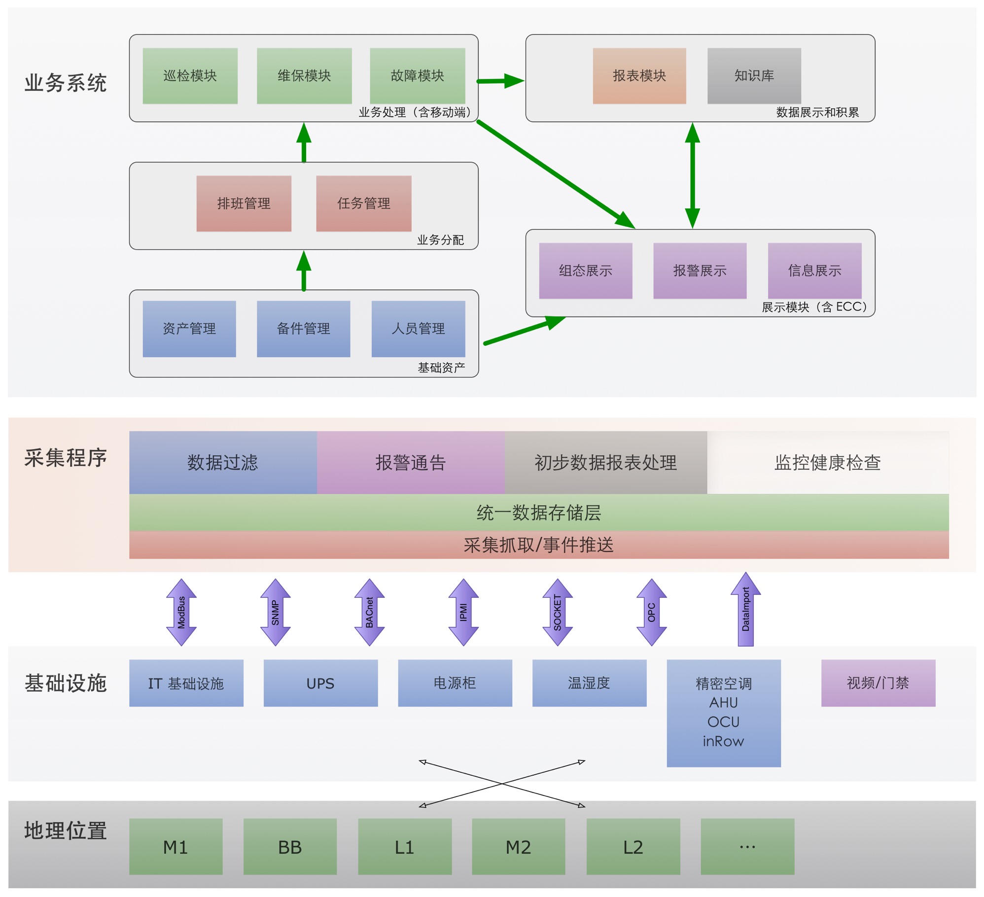 最近2年,伴随着大数据、机器学习和人工智能等相关技术领域在互联网行业被应用和推广的越来越多。作为相关技术最基础的保障,数据中心领域的技术发展可谓一日千里。 绿色数据中心和智能数据中心的相关理念被更多的互联网公司迅速的落地到各种新增的数据中心项目中。从数据中心综合化、智能化的监控和运维管理平台的方向上,DCIM平台的概念也很快的进入了各大互联网公司数据中心平台发展视野与规划。 DCIM (Data Center Infrastructure management) 系统是数据中心基础设施管理系统,是将IT(信息技术)和设备管理结合起来对数据中心关键设备进行集中监控、容量规划等集中管理。通过软件、硬件和传感器等,DCIM提供一个独立的管理平台,对数据中心IT设备和基础设施进行实时监控和管理。