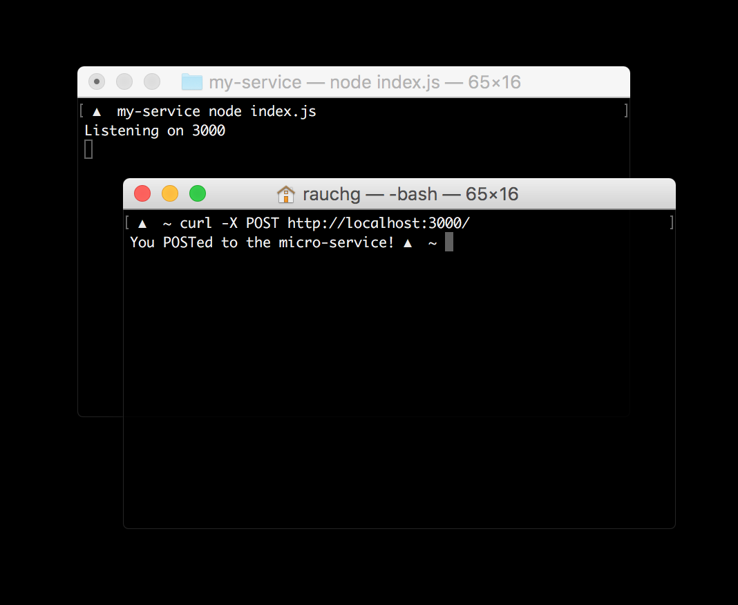 In another instance of the terminal, try POSTing some data with the curl utility (you can also learn more about curl).