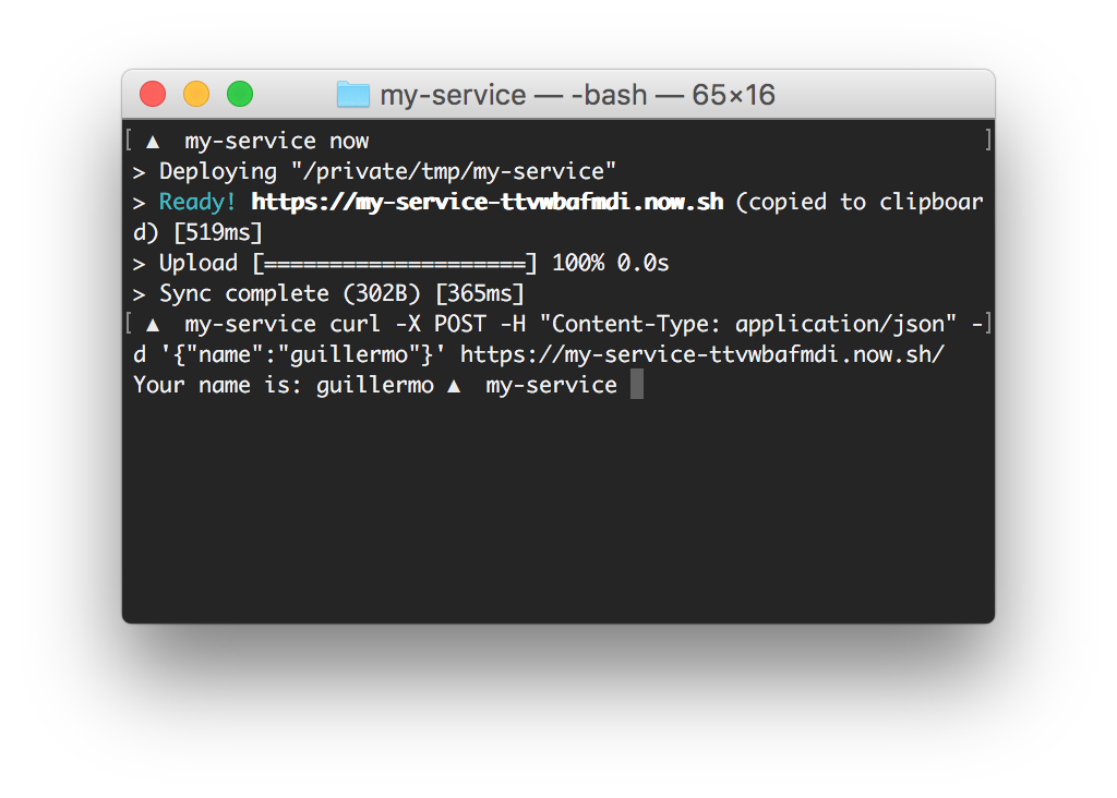 To deploy it, I simply type now again and I'll get a new URL.