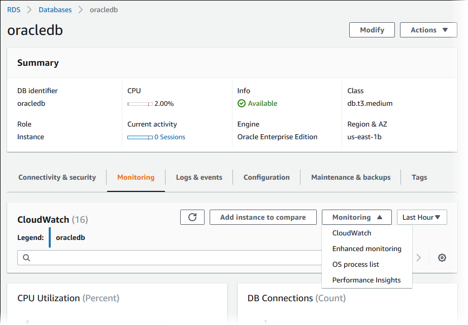 • CloudWatch – Shows a summary of DB instance metrics available from Amazon CloudWatch. Each metric includes a graph showing the metric monitored over a specific time span.