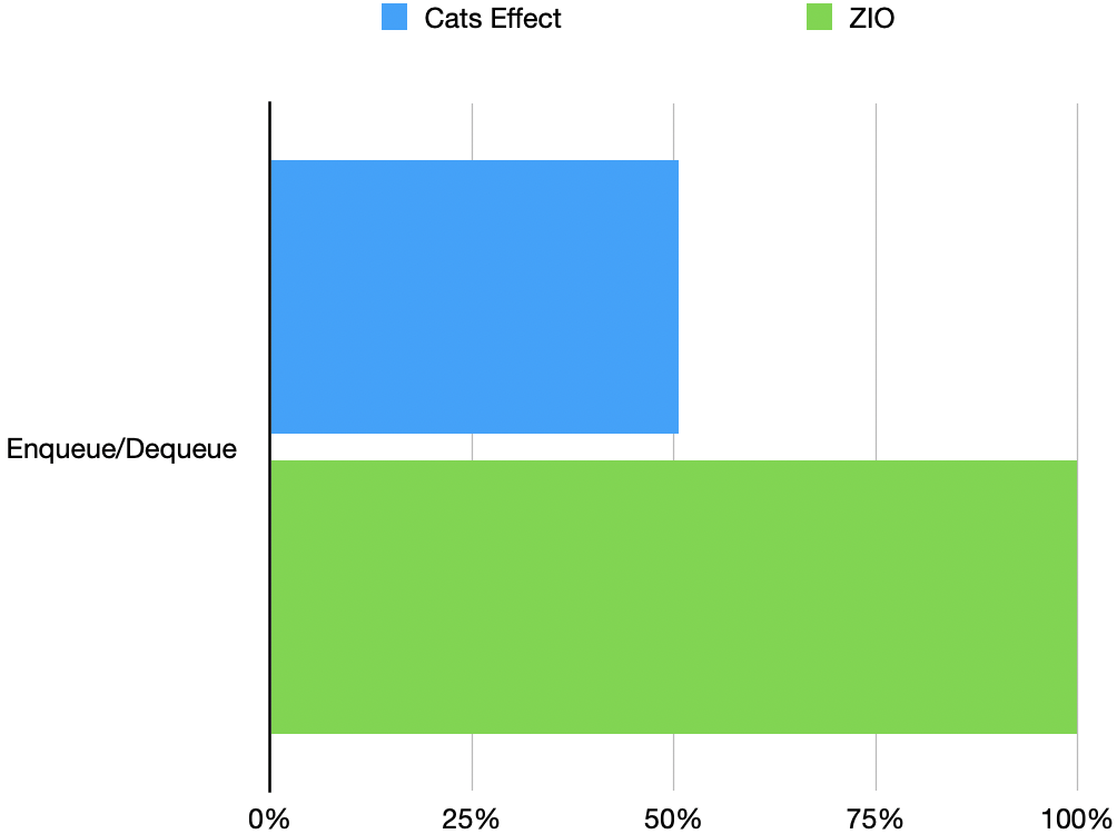 }This performs the same offer >> take sequence as in the Ping Pong test, but without spawning fibers. And as we can see in the results, ZIO's Queue is almost exactly twice as fast as Cats Effect's Queue.