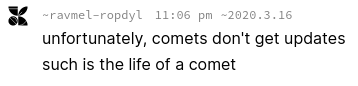 unfortunately for mr ropdyl here comets can update. they just dont know it! but i know it, behold this ONE WEIRD TRICK to make your comets update on urbit.