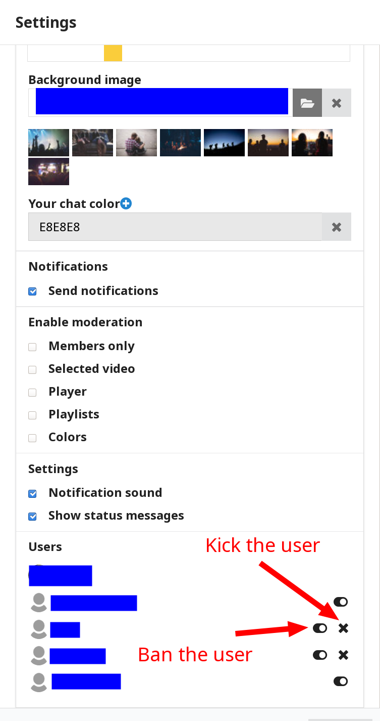 As you can see, you can moderate your Watch2Gether room. Unfortunately, you can't have delegate the task of moderation to other users, which a platform like Discord allows. Please bare this in mind, as it may be an unfamiliar setup.