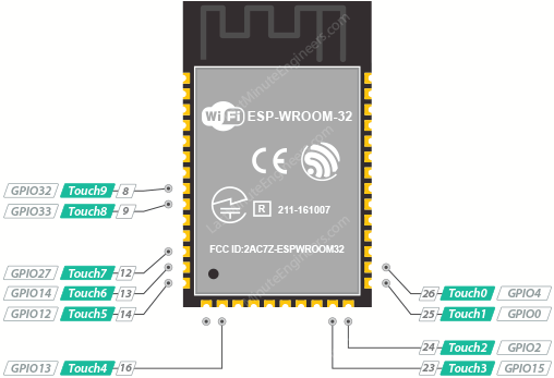 The ESP32-WROOM-32 module has ten capacitive touch-enabled GPIOs labeled TOUCH0 through TOUCH9. These pins work by measuring the change in capacitance when a finger or conductive object is near the surface of the pin.