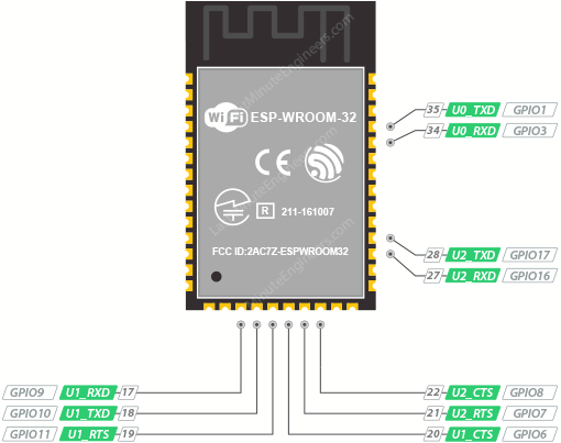 | 34 | RXD0 | GPIO3 | ❌ | Rx pin, used for flashing and debugging |