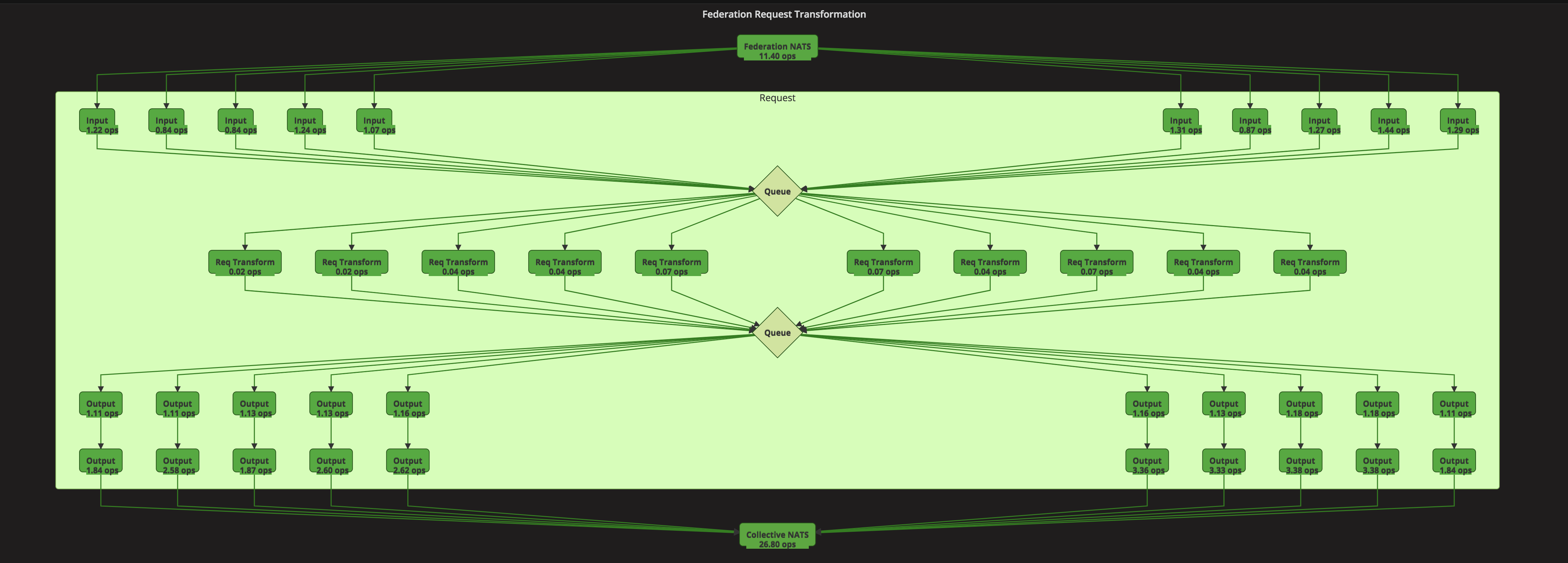 The client chops a large request into bundles of 200 nodes and publish them to the network for federation. Multiple federation brokers can thus take care of distributing it. This effectively offloads a huge amount of work from the Ruby client on your CLI to the network. Compared to unfederated mcollective a 200 fold decrease in work - now being offloaded to a big pool of fast Go based workers.