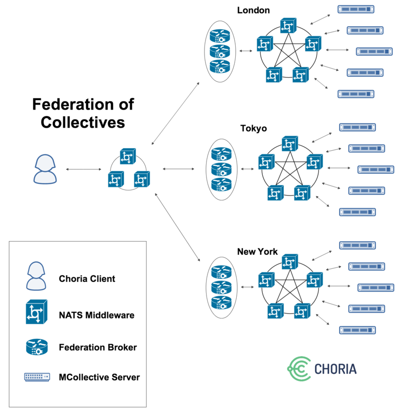 Choria supports Federating multiple collectives of nodes into a large Federated collective for the purpose of orchestrating.