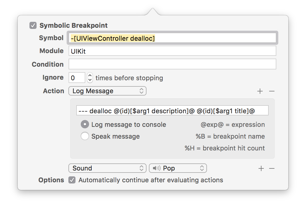 - Check "Automatically continue after evaluating actions" so Xcode does not stop at the breakpoint
