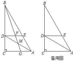 - (19衢州) 如图,在Rt△ABC中,∠C=90°,AC=6,∠BAC=60°,AD平分∠BAC交BC于点D,过点D作DE∥AC交AB于点E,点M是线段AD上的动点,连结BM并延长分别交DE,AC于点F、G.若点M是线段AD的中点,则