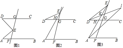 - 如图3,已知,AB∥CD,点E为射线FG上一点.若∠EAF=30°,∠EDG=40°,DI平分∠EDC,交AE于点K,交AI于点I,且∠EAI:∠BAI=1:2,∠AED=22°,∠I=20°,∠EKD=___. [142°]