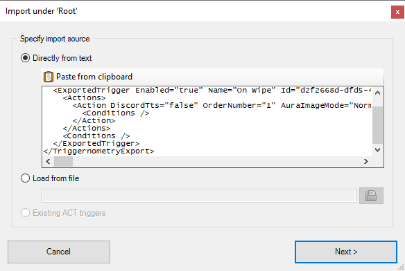 Next, go to Plugins > Triggernometry, right click a folder and press Import, then paste the contents of OnWipe.xml from the bottom of this page: