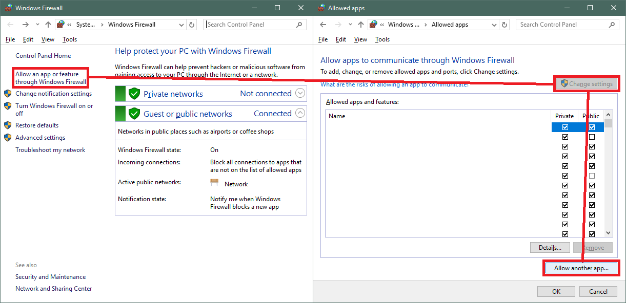 On the left, click Allow an app or feature through Windows Firewall. In the new window, click Change Settings, then Allow another app....