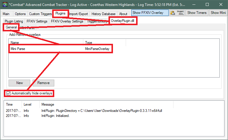 On the OverlayPlugin.dll tab, make sure an overlay of type MiniParseOverlay exists. If not, click New to add one with any name.