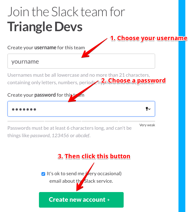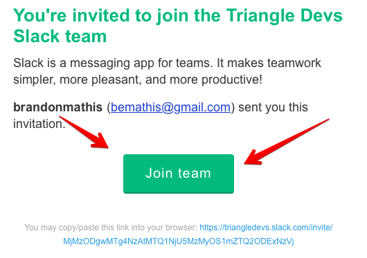 Go to your email and use the green "Join team" button to signin to the "Triangle Devs" Slack room