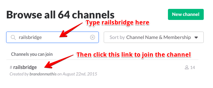 Type "railsbridge" into the text area and choose the railsbridge channel
