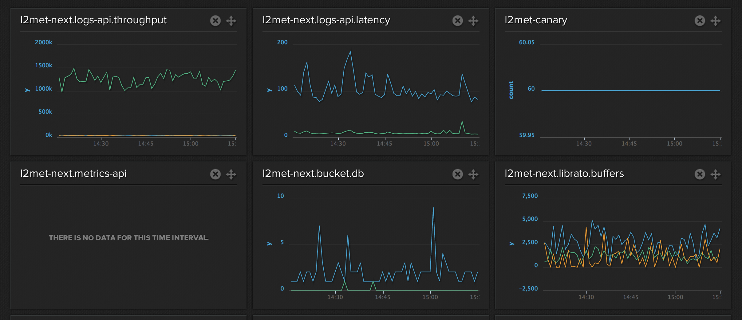 $ heroku logs -t -p router | awk '{print $10,$11,$12}'Using tools like log-shuttle and l2met we can build charts of system metrics.