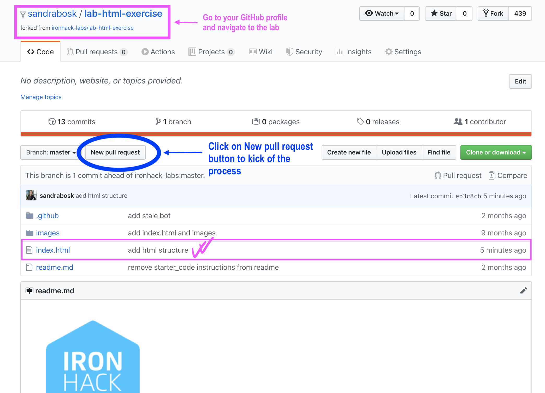 During your Ironhack journey, you have to fork each lab to be able to submit it. This way, your TAs, and instructors will be able to check your work and give you feedback.