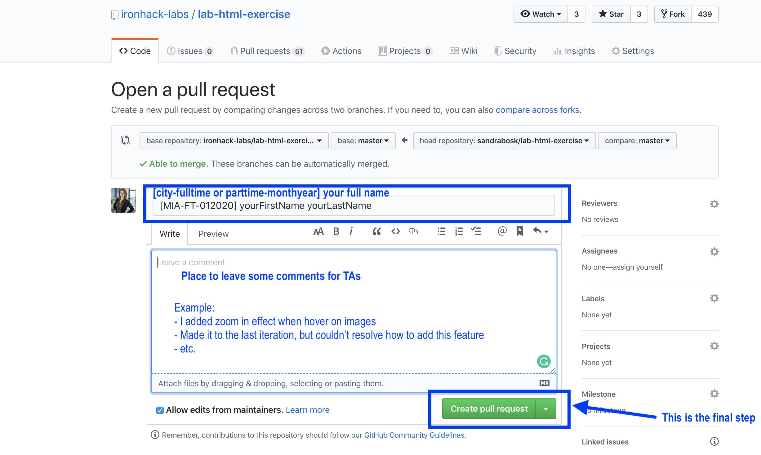 By pressing the green “Create pull request” button, you will create the pull request to the original lab repository.