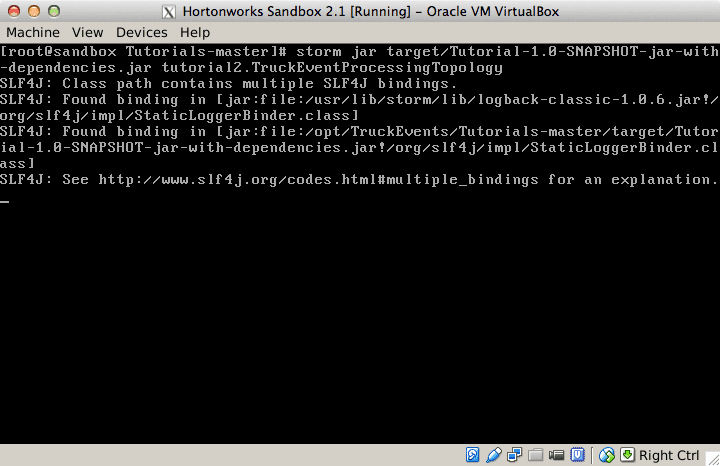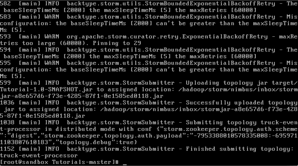 storm jar target/Tutorial-1.0-SNAPSHOT.jar.com.hortonworks.tutorials.tutorial2.TruckEventProcessingTopologyIt should complete with “Finished submitting topology” as shown below.