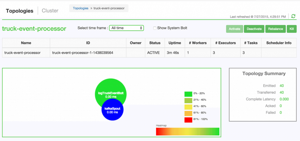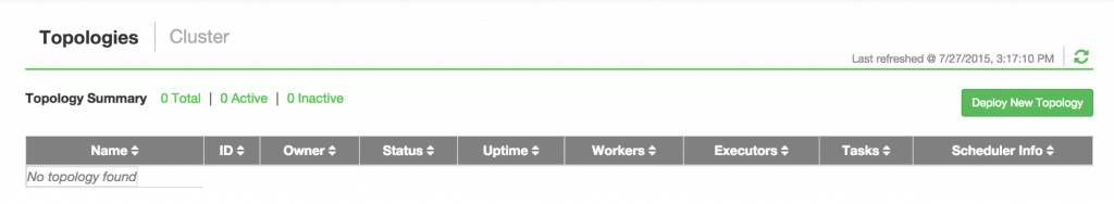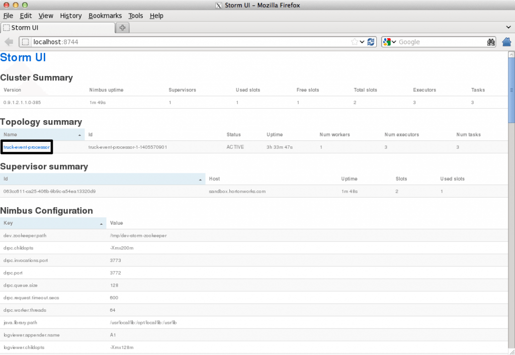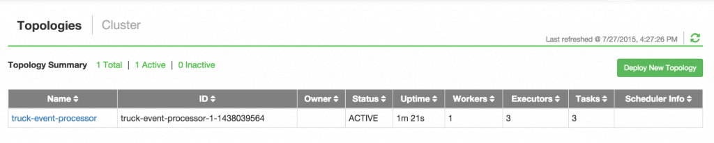 Refresh the Storm UI browser window to see new Topology ‘truck-event-processor’ in the browser.