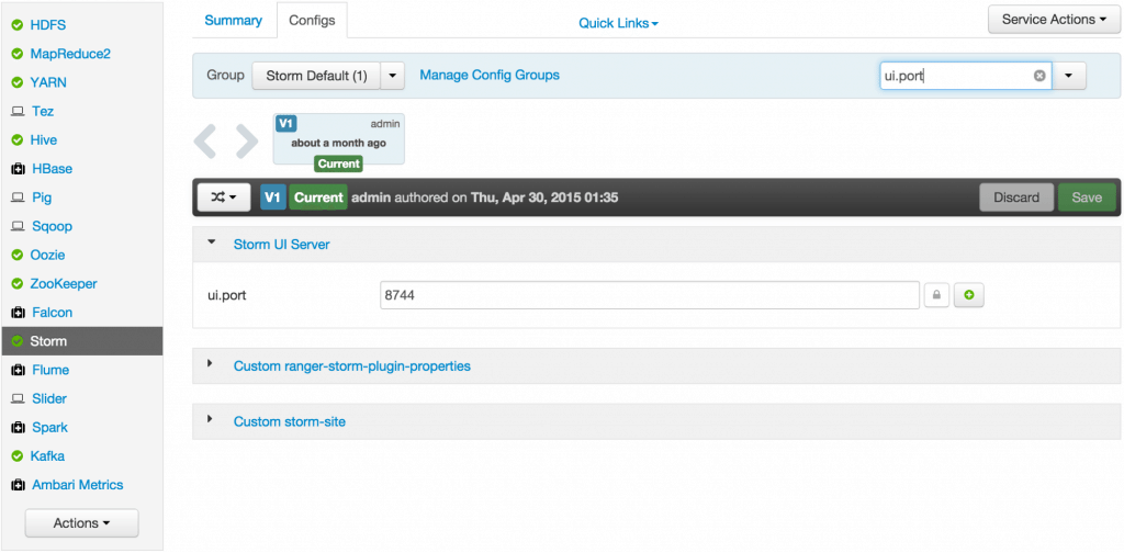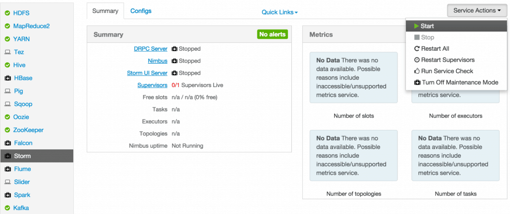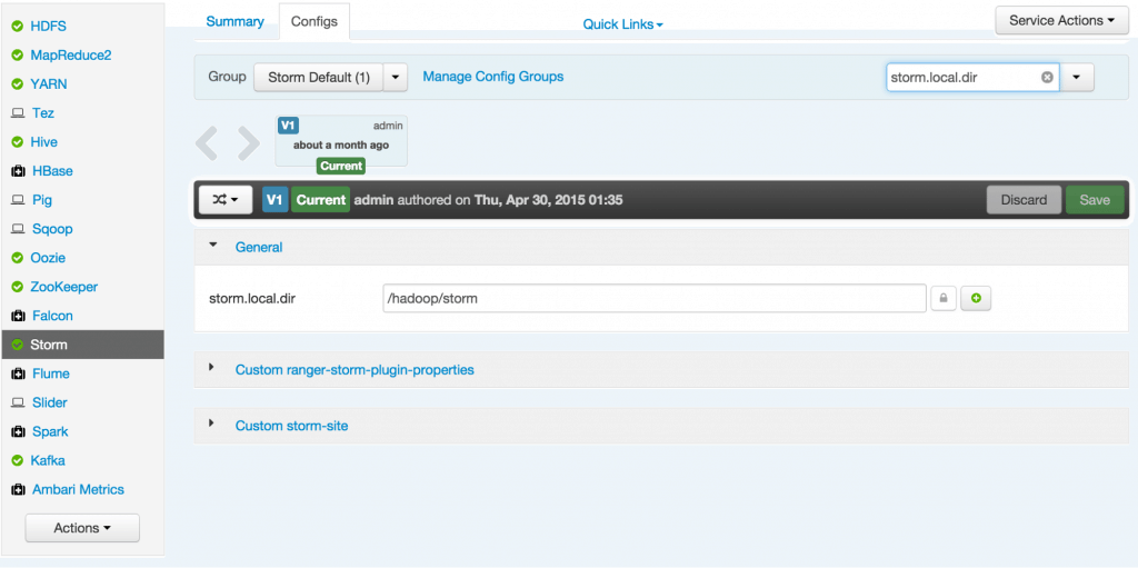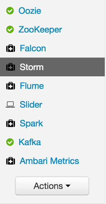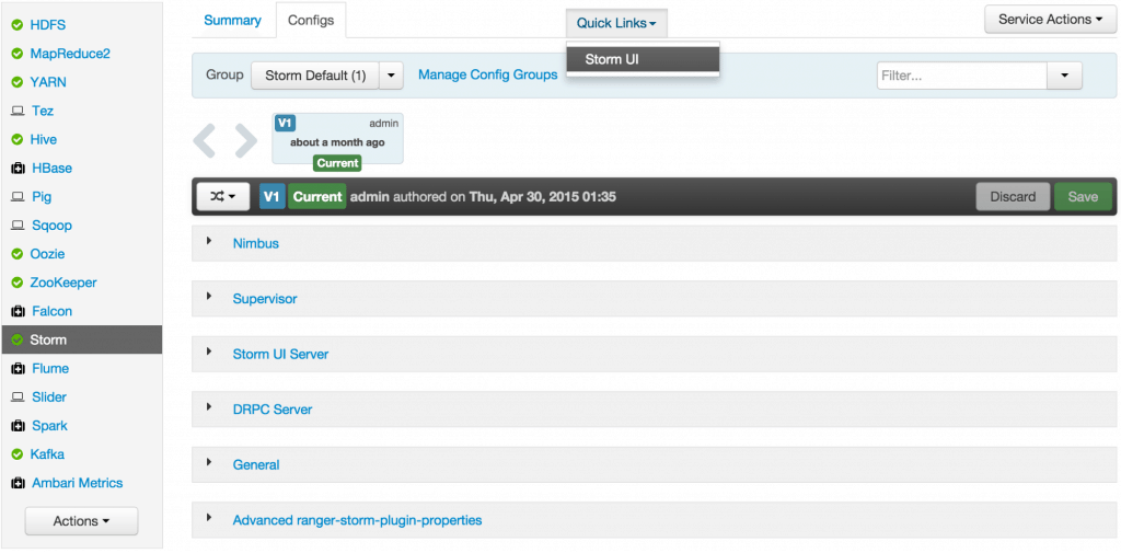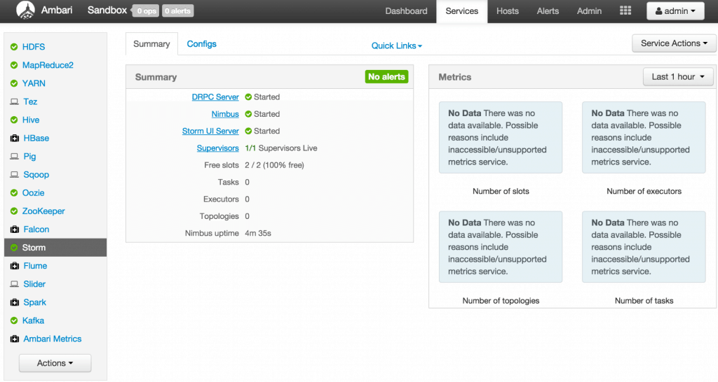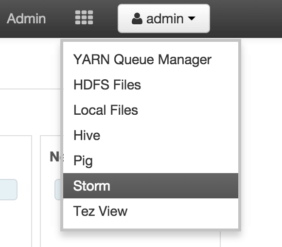 Started by logging into Ambari as admin/admin. From the Dashboard page of Ambari, click on Storm from the list of installed services. (If you do not see Storm listed under Services, please follow click on Action->Add Service and select Storm and deploy it.)