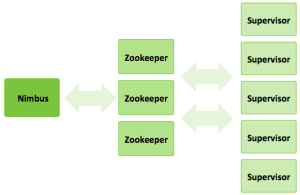 - Supervisor nodes – communicates with Nimbus through Zookeeper, starts and stops workers according to signals from Nimbus