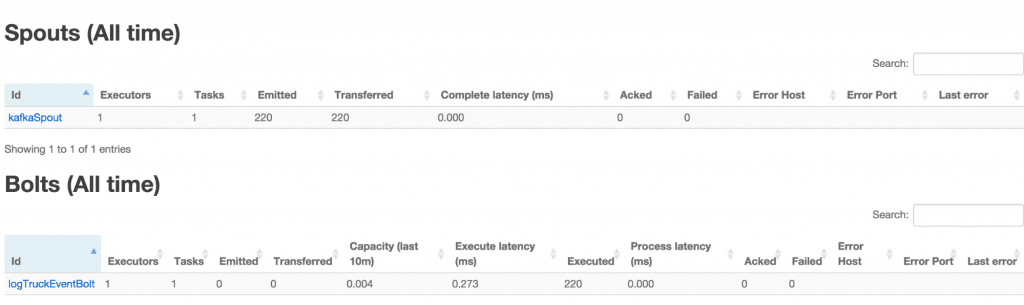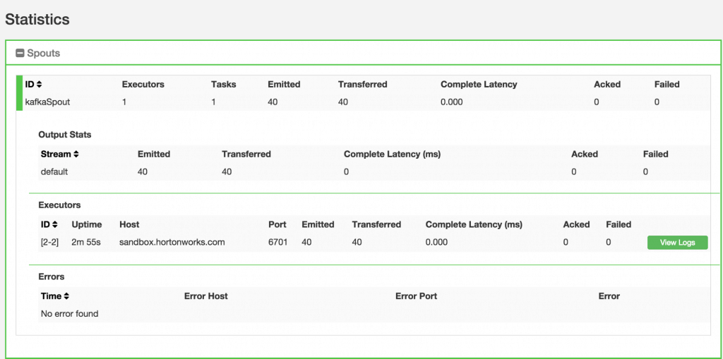 java -cp target/Tutorial-1.0-SNAPSHOT.jar com.hortonworks.tutorials.tutorial1.TruckEventsProducer sandbox.hortonworks.com:6667 sandbox.hortonworks.com:2181Go back to the Storm UI and click on “truck-event-processor” topology to drill into it. Under Spouts you should see that numbers of emitted and transferred tuples is increasing which shows that the messages are processed in real time by Spout