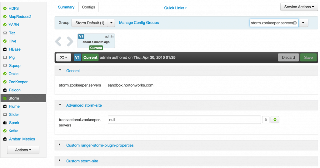 - Check zookeeper configuration: ensure storm.zookeeper.serversis set to sandbox.hortonworks.com