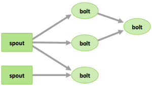 - Topologies – the overall calculation, represented visually as a network of spouts and bolts (as in the following diagram)