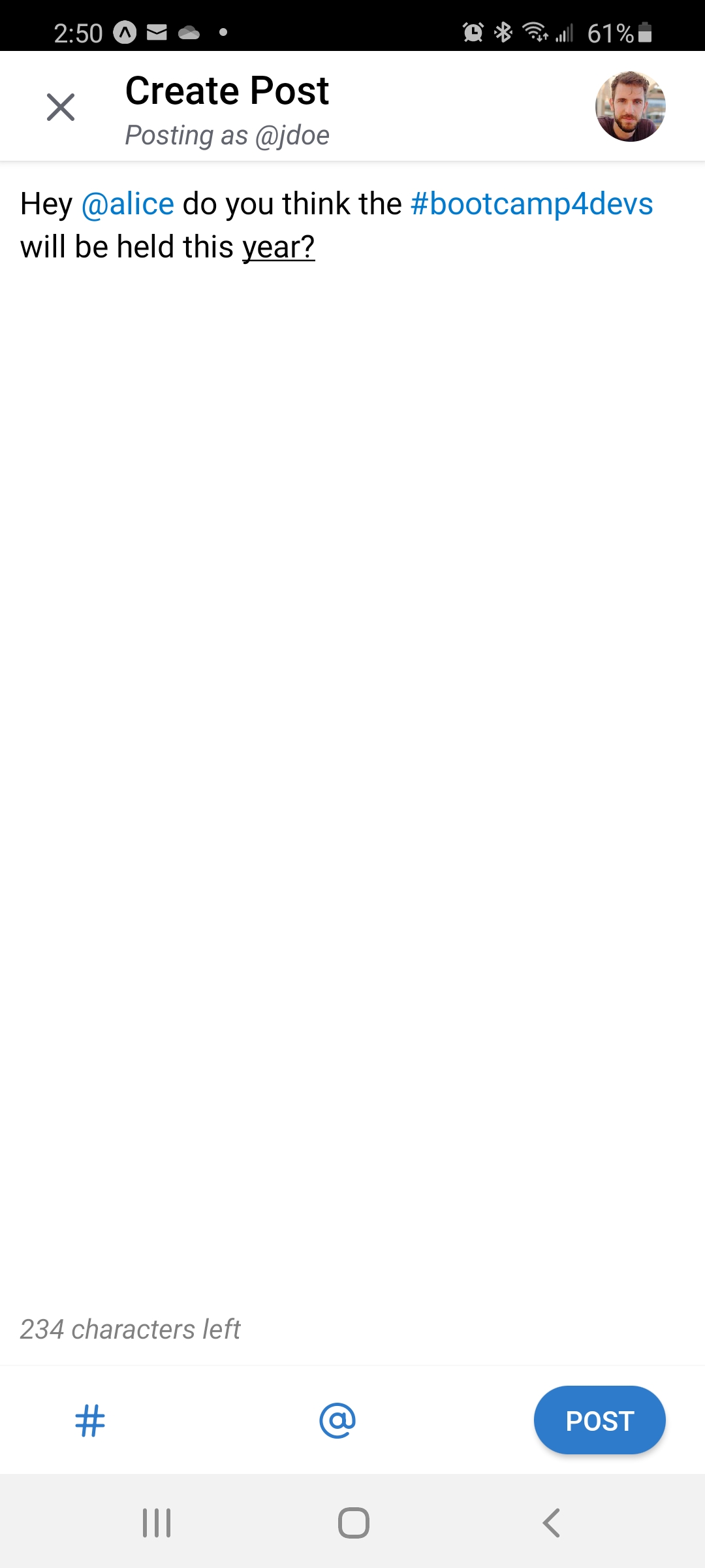 TextInputthat highlights mentions and hashtags .Note: If want your "Display" and "Input Area" as separate entities, the 2 snippets above will work, but if you want some sort of a rich text editor that highlights as you type the guide below might help.