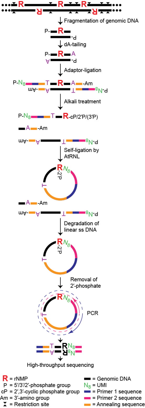 Here, we detail the steps of ribose-seq library construction as shown in Figure 1. Ribose-seq employs the unique capacity of Arabidopsis thaliana tRNA ligase (AtRNL) to ligate 2′,3′-cyclic monophosphate or 2′-monophosphate termini of DNA and RNA to 5′-monophosphate ends of DNA and RNA7,8. A double-stranded (ds) sequencing adaptor, which has both primer sequences for later PCR amplification step, is initially ligated to genomic DNA fragments as AtRNL prefers self-ligation or circularization. Alkali treatment exposes the rNMP-specific 2′,3′-cyclic monophosphate or 2′-monophosphate termini. Upon ligation by AtRNL, the rNMP is captured along with its upstream DNA sequence while unligated linear single-stranded (ss) DNA is degraded with T5 exonuclease. Yeast 2′-phosphotransferase Tpt1 then removes the 2′-monophosphate at the ligation junction, allowing subsequent PCR amplification of the library. The details given in this protocol correspond to Illumina library to be sequenced on MiSeq with 50-cycle single-end reads.