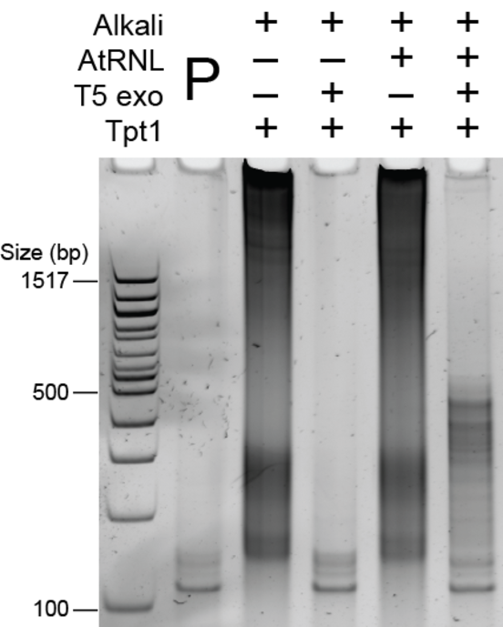Depending on the genotype of the cell, the cell type, and the organism, more genomic DNA and more reactions leading to more template for PCR may be necessary. The amount of template used and the number of cycles run during PCR can also vary. If using another DNA polymerase for PCR, different reaction conditions such as concentrations of DMSO and primers and annealing temperature need to be tested, minimizing the cycle number while minimizing the background amplification for AtRNL– T5Exo+ Tpt1+.