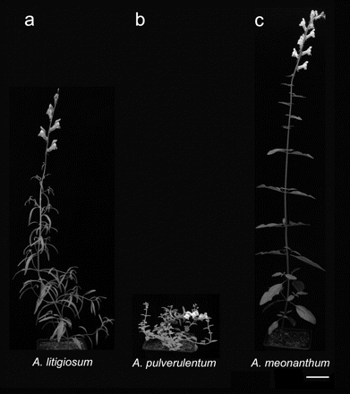Figure 2. Representatives of the three traditional subsections of the genus Antirrhinum. (a) Antirrhinum litigiosum (also known as Antirrhinum majus subspecies litigiosum), a member of subsection Antirrhinum; (b) Antirrhinum pulverulentum, a member of subsection Kickxiella; (c) Antirrhinum meonanthum, a member of subsection Streptosepalum. Bar, 50 mm.
