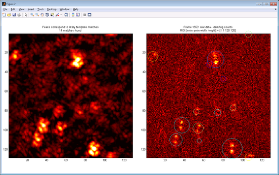 Figure 6. A single raw movie frame being analyzed by the SM-detection calibration module. Left: phase correlation of the raw image with the DH templates. Right: raw data with template matches indicated by colored circles. Larger circles indicate stronger matches, and will be saved with a higher threshold value.