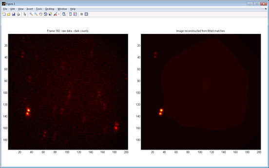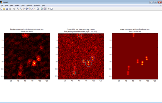 - 4.3: Whenever starting a new experiment, monitor this process as it proceeds to ensure that the threshold used includes the single molecules visible in the raw data, and to ensure that the fits are performed successfully. Only matches that score above the thresholds are fit, and good fits are plotted in the frame-by-frame reconstruction (see Figure 8). Here the definition of a good double-Gaussian fit is a fit that meets several straightforward criteria, hard-coded into the module. The tests performed to define a good fit are listed below under Troubleshooting (step 4).