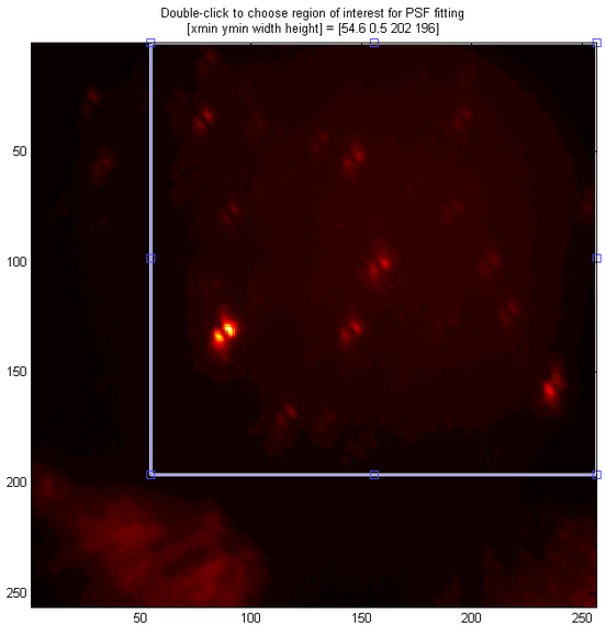 - 1.3: Select a region of interest (ROI) containing at least one bright fluorescent object by adjusting the box and double-clicking inside it (see Figure 2). Even though the calibration bead may be isolated (bright object toward lower-left of excitation spot in Figure 2), it is helpful to select an entire widefield excitation region so that the background fluorescence can be estimated accurately.