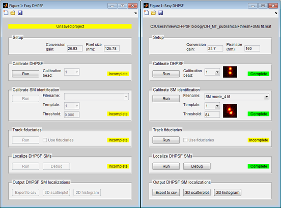Figure 1. The Easy-DHPSF command window: (left) before running any modules and (right) after localizing single molecules.