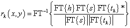 where FT{} denotes the two-dimensional Fourier transform, FT-1{} denotes the two-dimensional inverse Fourier transform, and the prefilter h is a Gaussian lowpass filter with a width σ ≈ 1.5 pixels. Phase correlation emphasizes high frequency components in both the input image and the template (16), and these spatial frequencies typically have a lower signal to noise ratio than lower frequencies in the image. The Gaussian lowpass filter h emphasizes lower spatial frequencies present in both the input image and the template and thus leads to more reliable estimates.