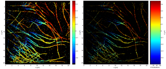 Figure 11. Sample histograms of labeled microtubules conveying 3D localization information. Left: Localization bins color-coded by median z position. Right: Localization bins color-coded by both number of localizations and median z position to convey density information.