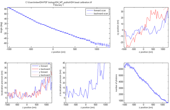 The second image stack is a calibration scan. This should comprise a series of frames of a fiducial at different known z positions generated using an axial nanopositioner in the microscope. The sequence of steps used to generate the scan is fed to the program in the form of a ‘sequence log file’, which should be an ASCII text file with a .dat extension and can be generated using the included ‘writeCalDatFile.m’ script. As shown in the example data, this scan should consist of approximately 50 steps sampling the entire z range of the DH-PSF, with ~10 acquisitions at each step to improve the precision of the measurement and provide localization precision information at each position.