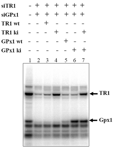DT cells were stably transfected with pU6 control construct or the siTR1/siGPx1 double knockdown construct, and the stably transfected siTR1/siGPx1 double knockdown cells were then transiently transfected with the pcDNA3.1 expression vector or the expression vector encoding TR1 wild type gene (TR1 wt), TR1 knock-in gene (TR1 ki), GPx1 wild type gene (GPx1 wt), GPx1 knock-in gene (GPx1 ki) or TR1 and GPx1 knock-in genes (TR1 ki-GPx1 ki). Transfected cells were labeled with 75Se, cell extracts prepared and electrophoresed as follows: lane 1, cells stably transfected with the pU6 control construct were transiently transfected with pcDNA3 expression control vector; and lanes 2-7, cells stably transfected with the double siTR1-siGPx1 construct were transiently transfected with: lane 2, the pcDNA3.1 expression control vector; lane 3, TR1 wt; lane 4, TR1 ki; lane 5, GPx1 wt; lane 6, GPx1 ki; and lane 7, TR1 ki-GPx1 ki.. Cells stably transfected with the pU6 control construct or with the double siTR1-siGPx1 construct, but not subsequently transiently transfected with the pcDNA3 expression vector, gave virtually identical results as the corresponding stably transfected cells subsequently transiently transfected with pcDNA3 expression vector shown in lanes 1 and 2 (data not shown).