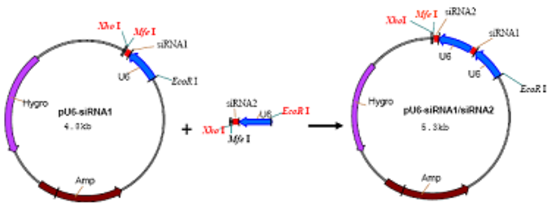 Each siRNA was cloned separately into the modified pSilencer 2.0 U6 vector. The 4.8 kb siRNA construct (designated pU6-siRNA1) was digested with Xho I/ Mfe I and the Xho I/ EcoR I siRNA2 fragment, which had been released from another siRNA construct, inserted into the pU6-siRNA1 construct generating a 5.3 siRNA construct (designated pU6-siRNA1/siRNA2). EcoR I and Mfe I have compatible cohesive ends, and following ligation, the new site cannot be re-cut by either endonuclease. Additional siRNA units can then be individually added to the pU6-siRNA using the same strategy.