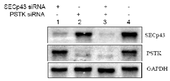 NIH 3T3 cells were stably transfected with siRNA constructs targeting individually SECp43 or PSTK or simultaneously SECp43 and PSTK wherein the two siRNAs are connected in tandem in the latter siRNA construct. The lanes show the following: 1, knockdown of SECp43; 2, knockdown of PSTK; and 3, double knockdown of SECp43 and PSTK.