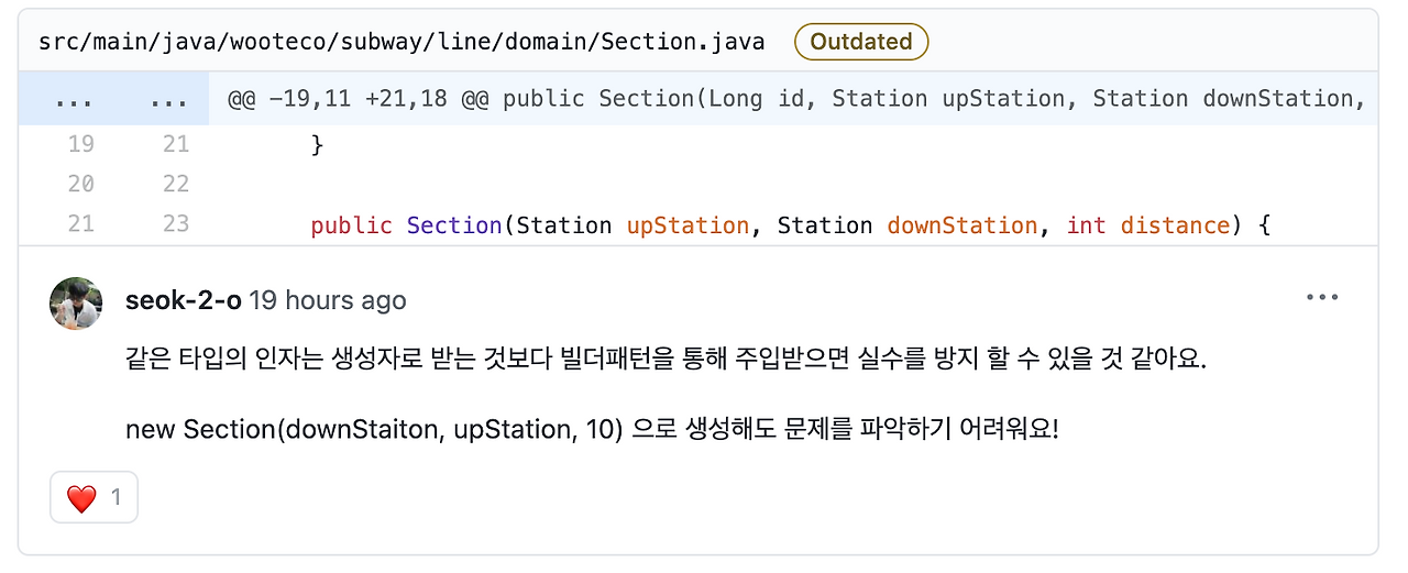 // 빌더 패턴의 대상이 될 Section 클래스 public class Section { private final Long id; private final Station upStation; private final Station downStation; private final int distance; // private 생성자로 변경 불가능한 객체 생성 private Section(Builder builder) { this.id = builder.id; this.upStation = builder.upStation; this.downStation = builder.downStation; this.distance = builder.distance; } // 정적 내부 클래스 public static class Builder { private final int distance; private Long id; private Station upStation; private Station downStation; // 생성자에서 타입으로 식별이 가능한 것은 Builder의 생성자 인자로 설정 public Builder(Long id, int distance) { this.id = id; this.distance = distance; } public Builder(int distance) { this.distance = distance; } // 타입이 동일해 구분하기 어려운 것들은 체이닝을 통해 set할 수 있도록 public Builder upStation(Station upStation) { this.upStation = upStation; return this; } public Builder downStation(Station downStation) { this.downStation = downStation; return this; } // 변경 불가능 객체 생성 메서드 public Section build() { return new Section(this); } }
