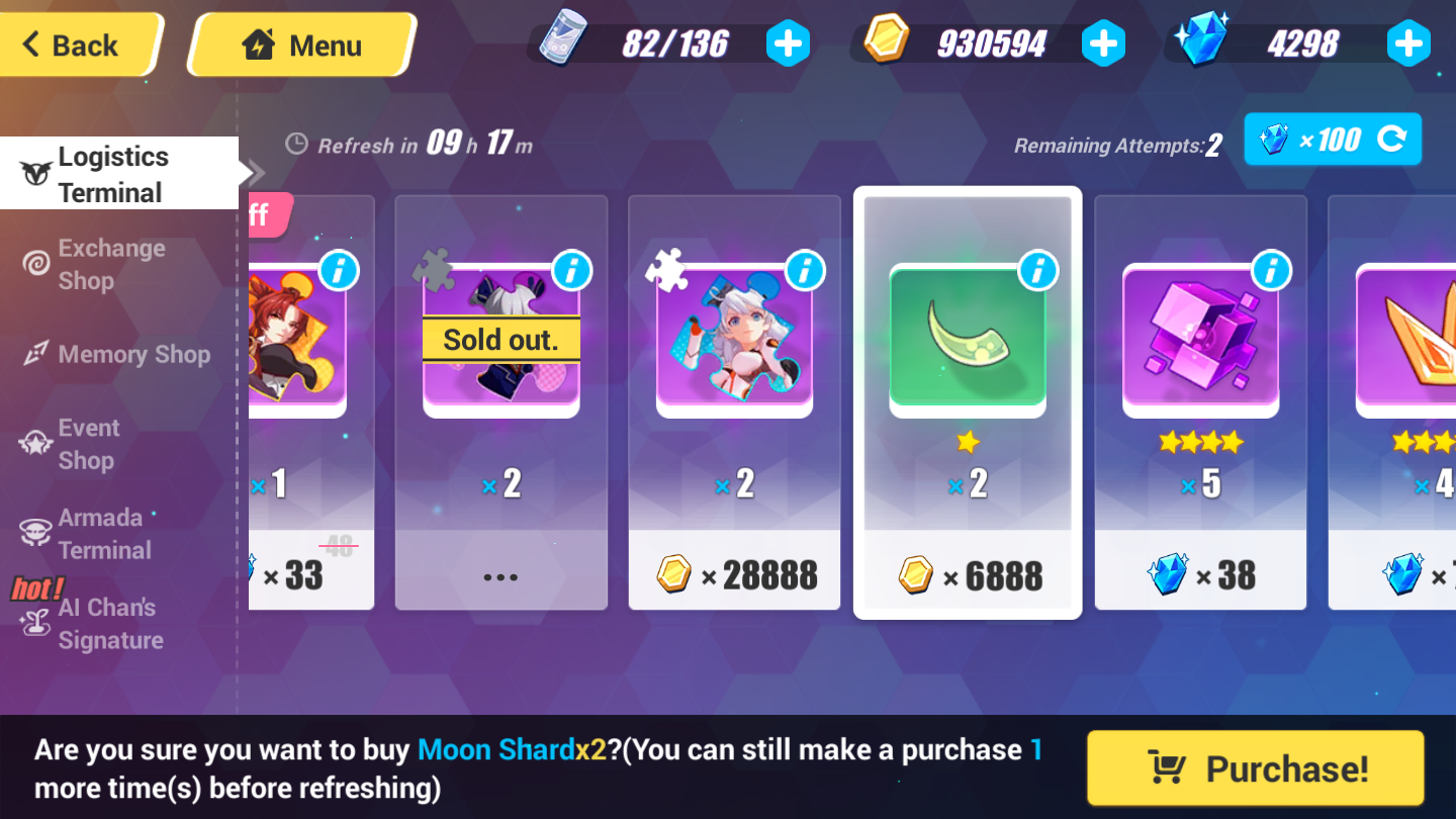 - Go in Shop > Logistic Terminal. Purchase 1 thing with coins. Don't buy anything here with crystals. My only purchases: Valkyrie Chariot / Crimson Impulse frags and if not, upgrade materials.