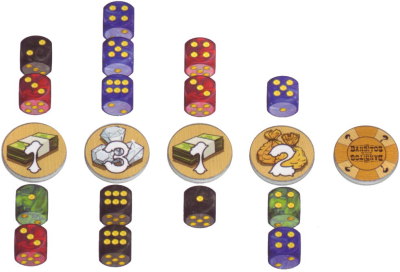 お宝チップを10枚、裏にして積み重ね、そのうちの4枚を二人のプレイヤーのあいだに並べる。ダイスをすべて袋に入れる。