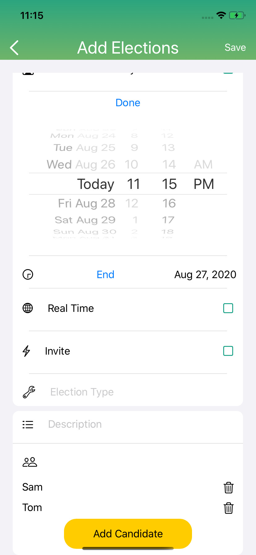 startingDate&endingDateofElection model. - Added mutating func for changeDays and Minutes for implementing